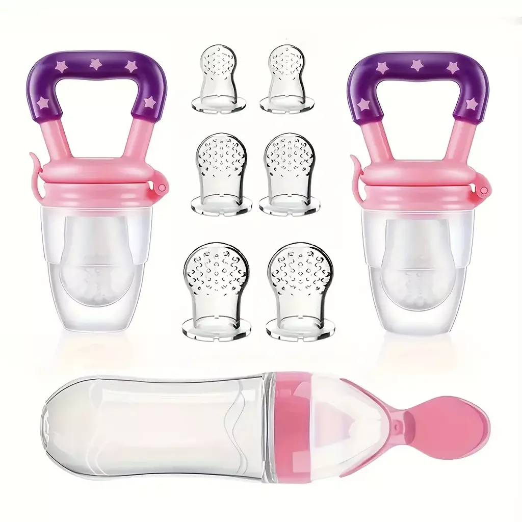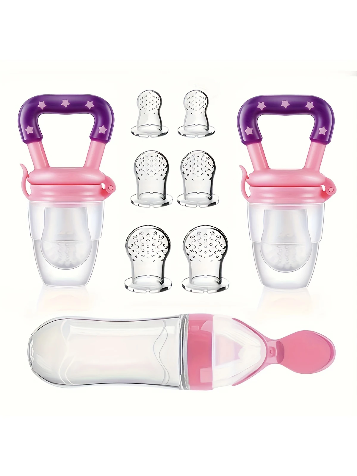 Conjunto de alimentação de bebê de 9 unidades: mamadeira de silicone de 1 unidade com colher, 2 chupetas para alimentação de frutas, 6 bolsas de malha (2 unidades S + 2 unidades M + 2 unidades L)